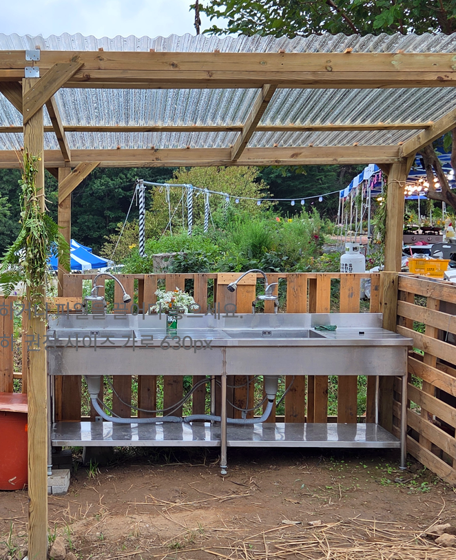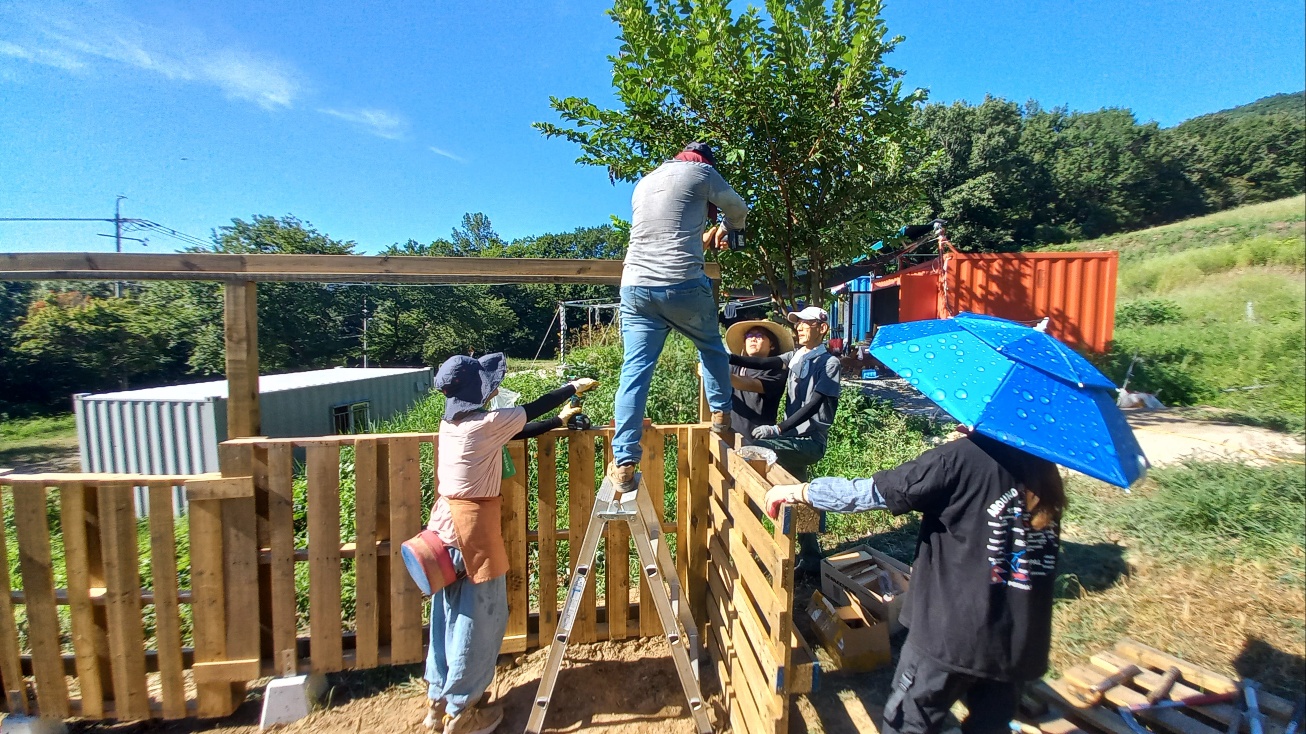 | | | 건축학교 1기, 어떻게 시작되었나요? 처음 대회 장소인 알프스 구르뫼를 답사했을 때는 정말 아무것도 없는 들판이었어요. “과연 여기서 네트워크 대회를 할 수 있을까?”라는 생각만 맴돌았죠. 그런데 곰곰이 생각해 보니, 아무것도 없어도 괜찮겠더라고요. 다 같이 모여 알프스 구르뫼의 풀을 뜯어먹고, 노래하며 춤춘다면 그것만으로도 행복하잖아요. 아무것도 없었던 상황에서 퍼머컬처의 정신(?)을 발휘해 “없으면 만들자!” 라는 이야기가 자연스럽게 이어졌어죠. 특히 잘 먹기 위해서는 부엌이 꼭 필요하고, 화장실과 샤워장도 필요하다는 의견이 모여졌어요. 그렇게 필요한 것들을 만들다보니, 필요한 기술을 나눌 수 있는 건축학교로 자연스럽게 연결되었어요. 생태화장실은 PDC 30기가 수업 중에 만들고, 샤워장은 기획단에서 만들었습니다.    첫 작업이 야외부엌이었죠? 어떤 지점들에 신경을 쓰셨나요? 퍼머컬처가 지향하듯 새 것을 사지 않고 최대한 재활용하려고 했어요. 하지만 여러 사람이 함께 쓰는 공간이고, 특히 알프스 구르뫼에는 어린 아이들도 많이 오니 ‘안전’만큼은 포기할 수 없었죠. 그래서 버려지는 팔레트를 활용하되, 안전이 필요한 부분은 튼튼한 기둥목과 브라켓을 사용해 보강했습니다. 제가 강릉에 살다 보니, 지붕이 바람에 날라갈까 봐 특히 신경이 쓰는데요. 그래서 바람이 부는 방향을 관찰해 부엌의 위치를 정하고, 기둥 아래에 땅을 파 추춧돌을 묻었습니다. 사실 이 추춧돌 작업이 제일 힘들고 시간도 오래 걸렸어요.   건축학교 참여자들과 함께 만들며 기억에 남는 순간들도 궁금해요.  이번 건축학교에서 인생 처음으로 드릴과 각도톱을 잡아봤다고 하신 분들이 몇 분 계셨어요. 처음에는 기계를 무서워했지만, 시간이 지나자 제법 능숙하게 다루시더군요. 아찔한 순간도 있었지만 무사히 마쳤어요. 그리고 땀을 뻘뻘 흘리며 일하면서도 모두 웃으며 서로를 응원하던 순간이 오래 기억에 남습니다. 도면 초안을 꼼꼼히 검토해 준 ‘빼꼼숲밭’의 새공님과 농부, 밥통, 알프스, 주녁, 짱아, 하루살이까지 멋진 부엌을 위해 함께 고생해 주신 분들께 감사드려요.