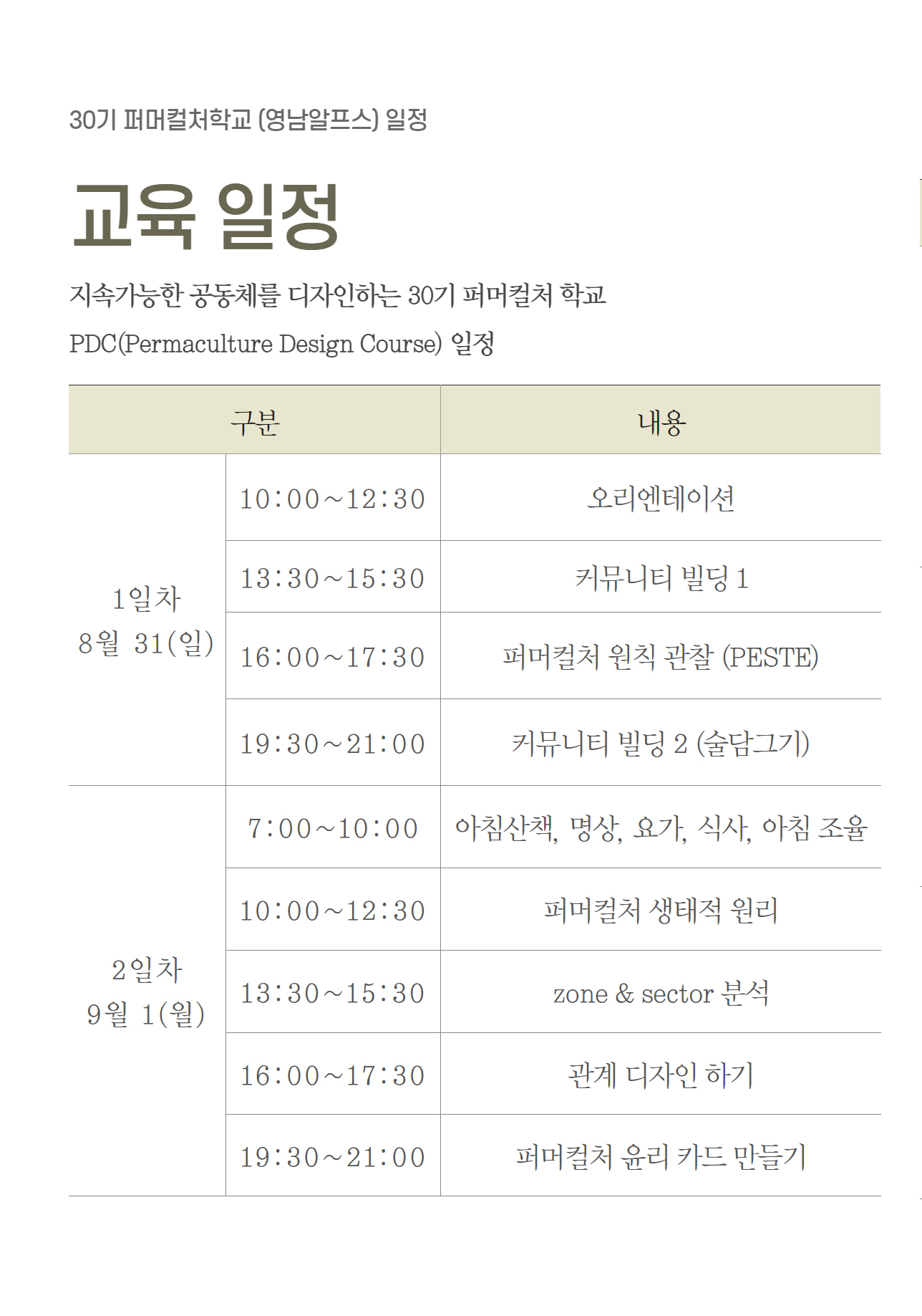 PDC(Permaculture Design Course) 일정