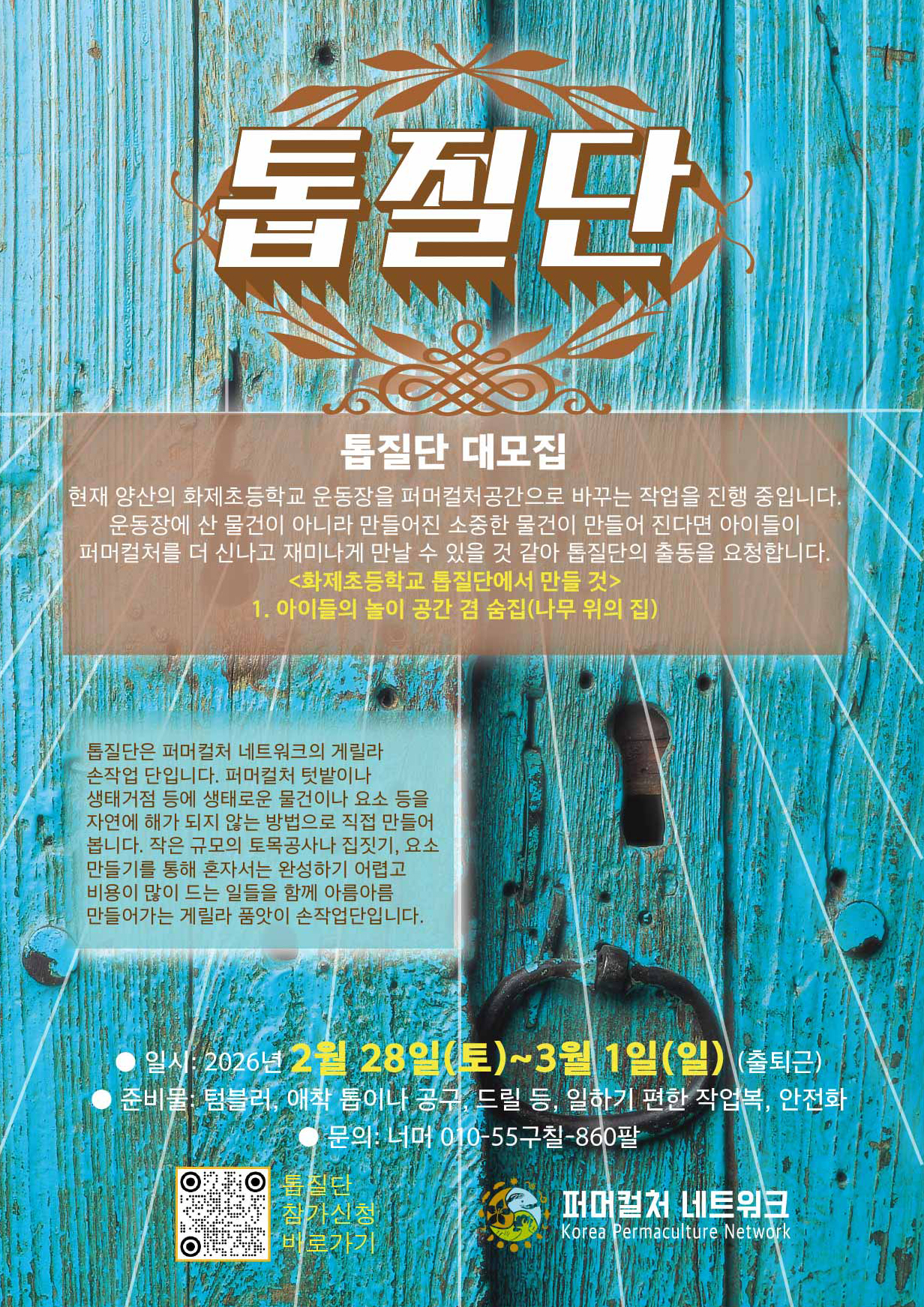 ※톱질단은 퍼머컬처 네트워크의 게릴라 손작업 단입니다. 퍼머컬처 텃밭이나 생태거점 등에 생태로운 물건이나 요소 등을 자연에 해가 되지 않는 방법으로 직접 만들어 봅니다. 작은 규모의 토목공사나 집짓기, 요소 만들기를 통해 혼자서는 완성하기 어렵고 비용이 많이 드는 일들을 함께 아름아름 만들어가는 게릴라 품앗이 손작업단입니다.